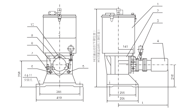 1、貯油筒;2、泵座;3、帶連結法蘭的柱塞泵裝置;4、減速電機5、加油口G3/4;